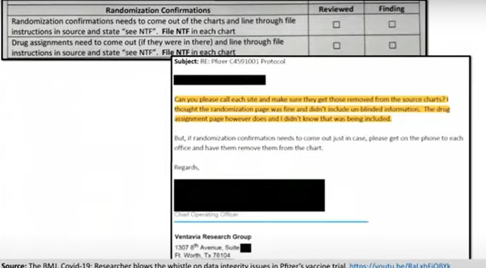 Unblinding, as I think everybody knows, creates serious concerns about data integrity. Once this massive error was discovered, Ventavia asked staff to go through each and every chart to take out the randomization and drug assignment confirmations. You can see here an email from Ventavia’s COO reacting after discovery of the problem: they had not even realized that the drug assignment confirmation contained unblinding information.