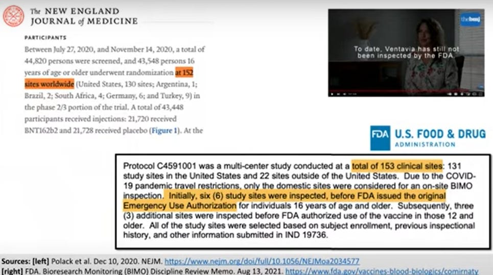 In the heat of a pandemic, it’s not hard to imagine that corners were cut and mistakes were made. Some mistakes are benign, but others carry serious consequences to data integrity. One hopes Ventavia is an extreme outlier, but we need more than just hope. We need evidence that the data were dealt with properly. We need regulatory oversight. But despite whistleblower Brook Jackson’s direct complaint to the FDA, FDA never inspected Ventavia. In fact, FDA only inspected 9 of the trial’s 150-plus sites before approving the vaccine. Just 9 sites. And Pfizer continues to use Ventavia for trials.