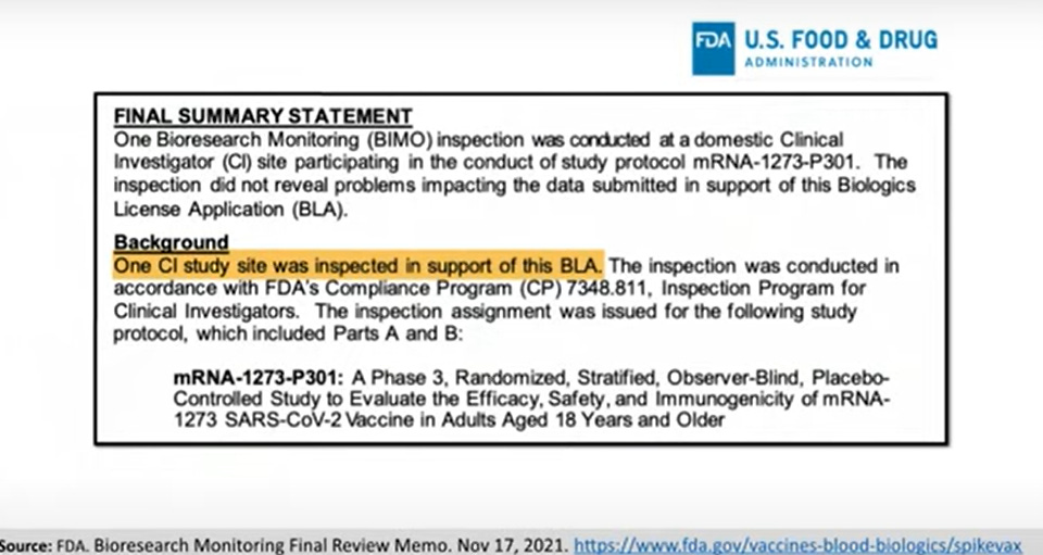 What about Moderna? FDA had over a year and inspected just one – ONE – of the trial’s 99 sites. How can FDA feel confident in the Moderna data based on a 1% sample?