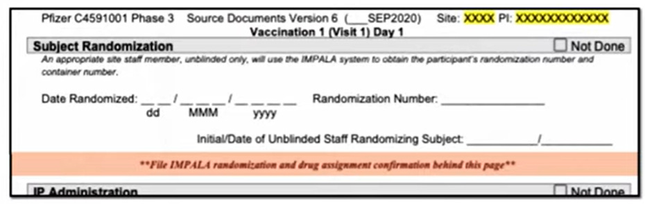 And unblinding may have occurred on a far wider scale. Here you can see the document containing the instructions Ventavia staff were given to file each trial participant’s randomization and drug assignment confirmation sheet into each participant’s chart. This contained unblinded information.
