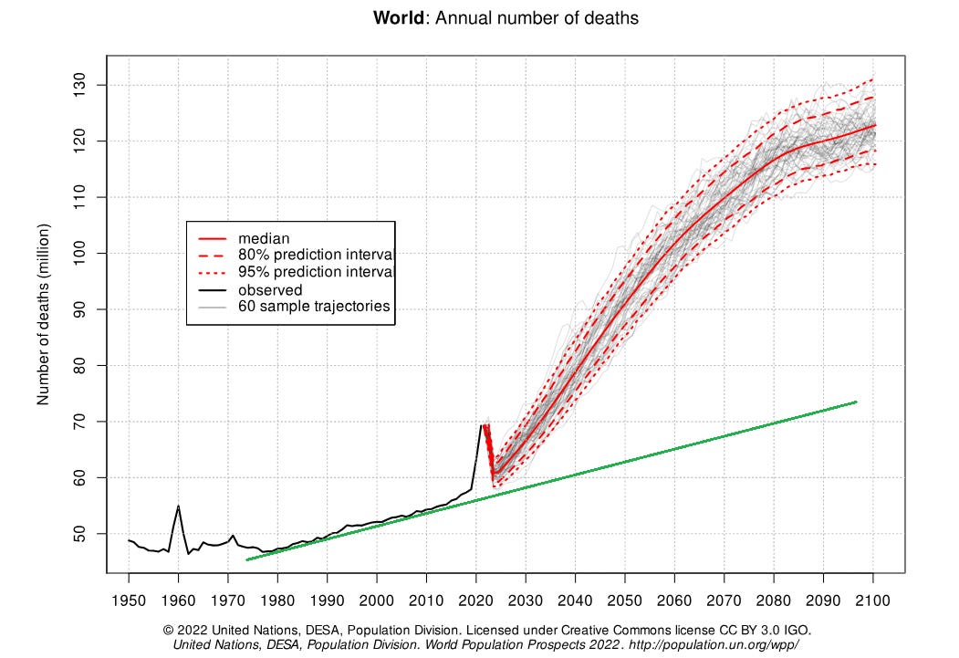 Take for example, annual global deaths. I have added the 1980-2020 trendline, myself, in green. Look at where deaths should have been heading compared with where they are predicted to go now. Even with life supposedly back to normal, deaths are increasing at an abnormally high rate.