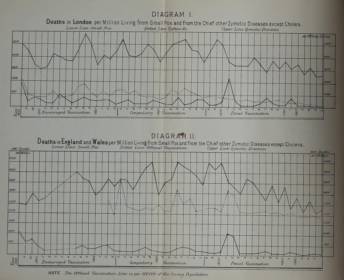He provides data, such as the diagrams below to show that vaccination did not diminish small-pox. The diagrams show deaths per million living during periods of ‘encouraged vaccination’, ‘compulsory vaccination’ and ‘penal vaccination’.