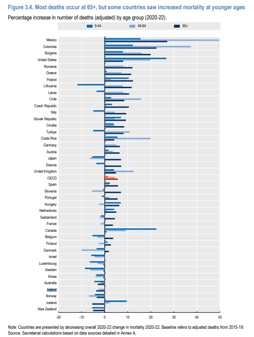Nearly all the OECD counties saw rapid demographic change with the size of the 65+ population increasing by 19% between 2015 and 2022. The study concludes that when adjusting for demographic change, the average adjusted increase in the number of deaths for OECD would be +5.3%.