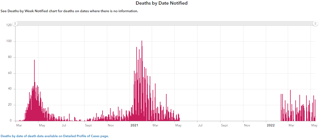 You can still go on to the Irish Covid dashboard and see the scary charts they produced to enforce lockdowns. Here is the chart for deaths by date notified.