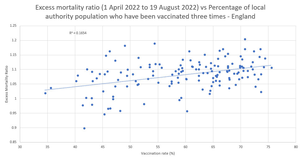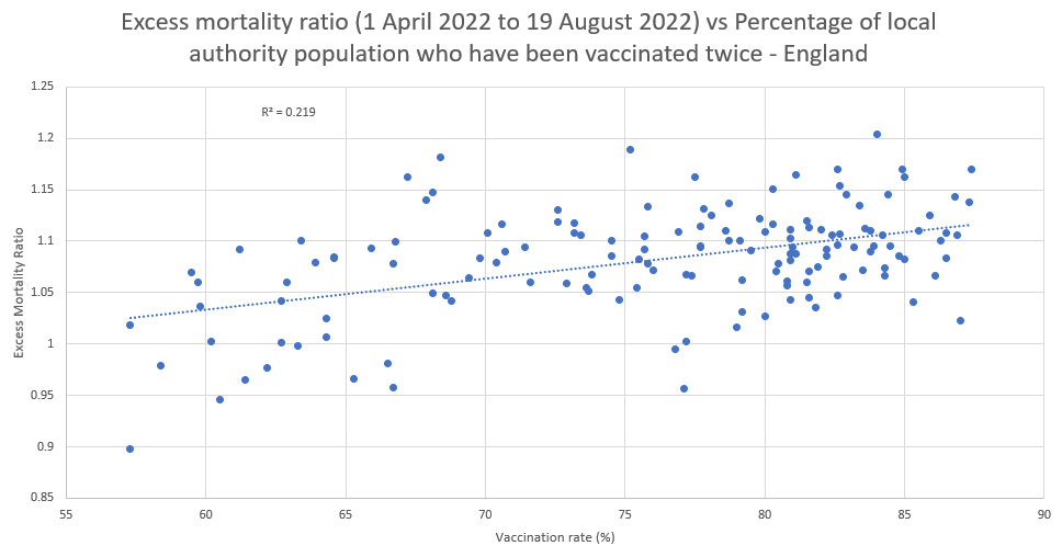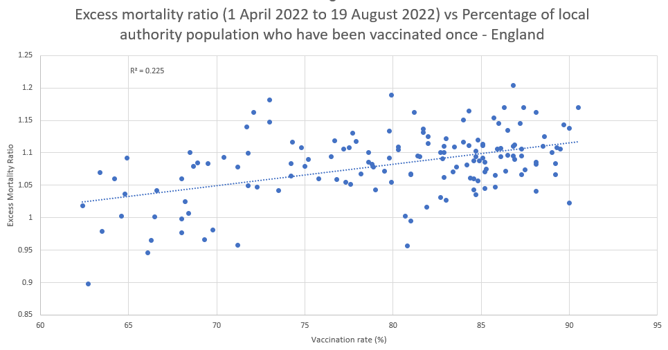 The R squared number is 0.225 meaning that between one fifth and one quarter of the excess mortality ratios can be predicted from the vaccination rates.