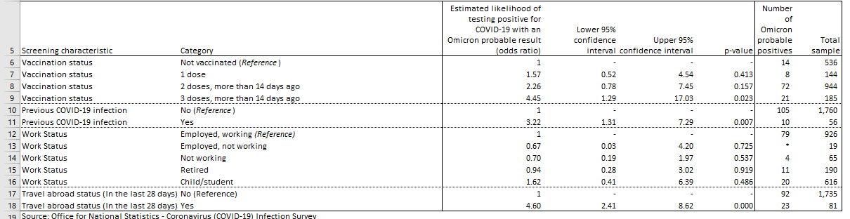 Look at the table above. As the vaccination status increases, the likelihood of testing positive with Omicron increases from 1.57 in one dose individuals, to 2.26 in two dosed and 4.45 in 3 dosed. Due to the small dataset, this is only a modelled likelihood of testing positive with Omicron. This also means the upper and lower confidence intervals are pretty big. However, the upper confidence interval for boosted individuals is 17.03, which is extremely high.