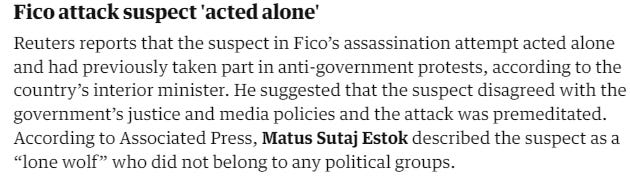The Guardian and all other MSM outlets reported that the assailant, Juraj Cintula, was a ‘lone wolf’ who did not belong to any political groups. Using our simple rule above we can translate this as meaning that Cintula was NOT a ‘lone wolf’ and DID belong to a political group.
