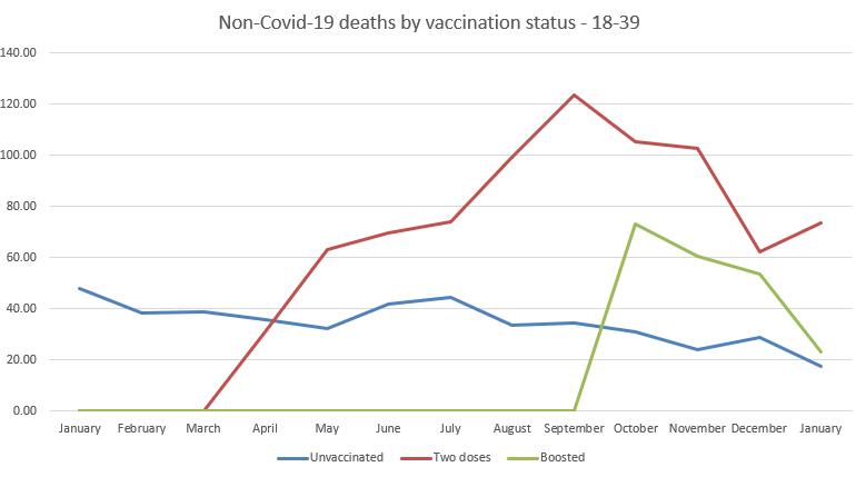 What is particularly worrying is how high the non-Covid mortality rate is when compared to the unvaccinated. With the double jabbed, it continued to worsen throughout the year and is again moving upwards. This group represents almost a third of the population in the 18-39 age group. It will be interesting to see how the boosted group fares throughout the year, whether their mortality rate will remain similar to the unvaccinated or start increasing like the double jabbed rate did.