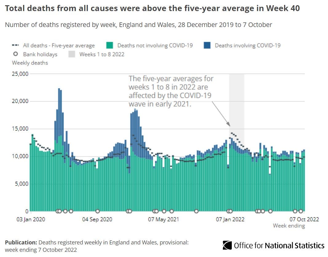 Since March of this year, excess deaths have shot up, the majority of which are not Covid deaths. In this last week alone there have been 1,372 excess deaths in England and Wales which is 14% above the five year average.